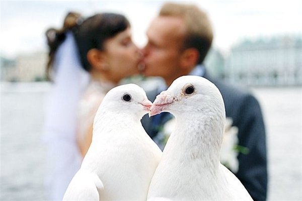 испачканные голубями свадебные наряды сулят безбедную жизнь молодоженам.